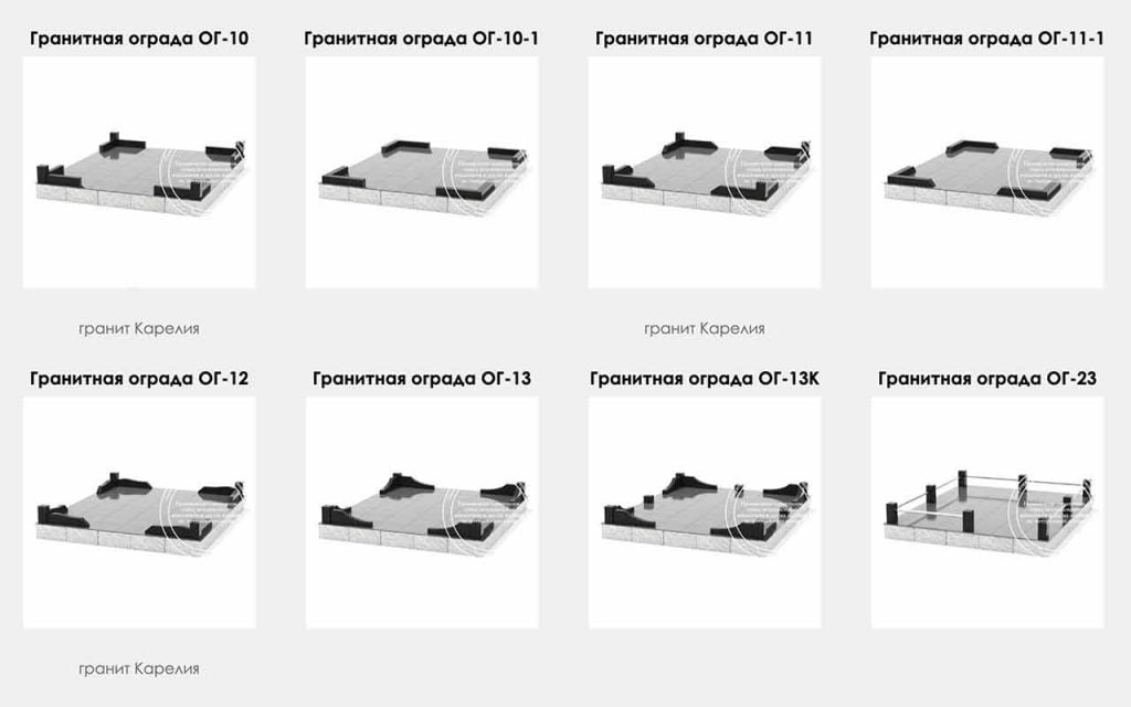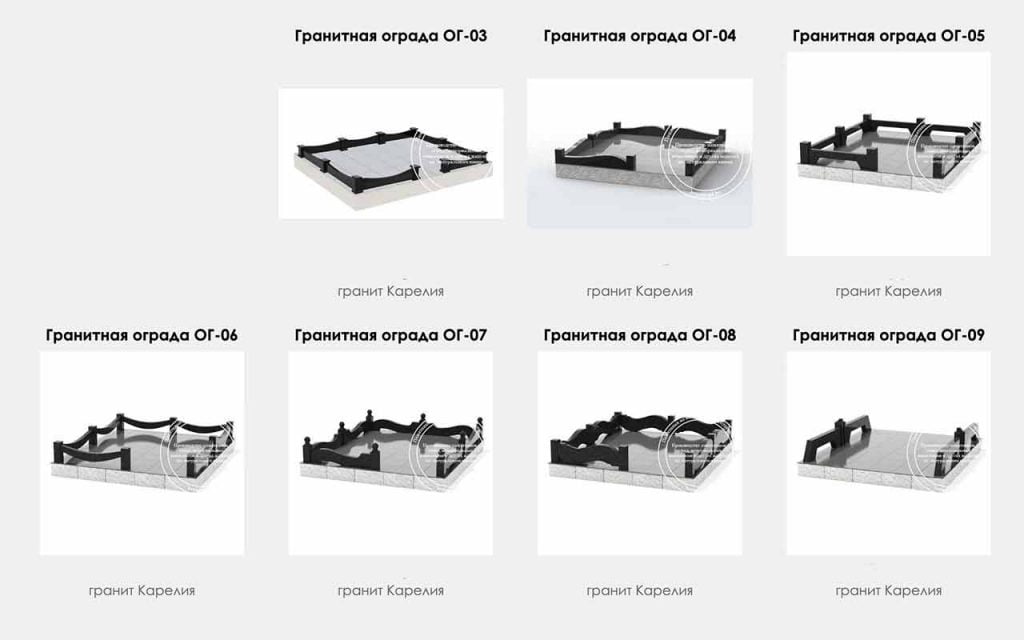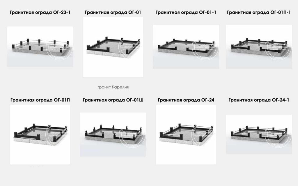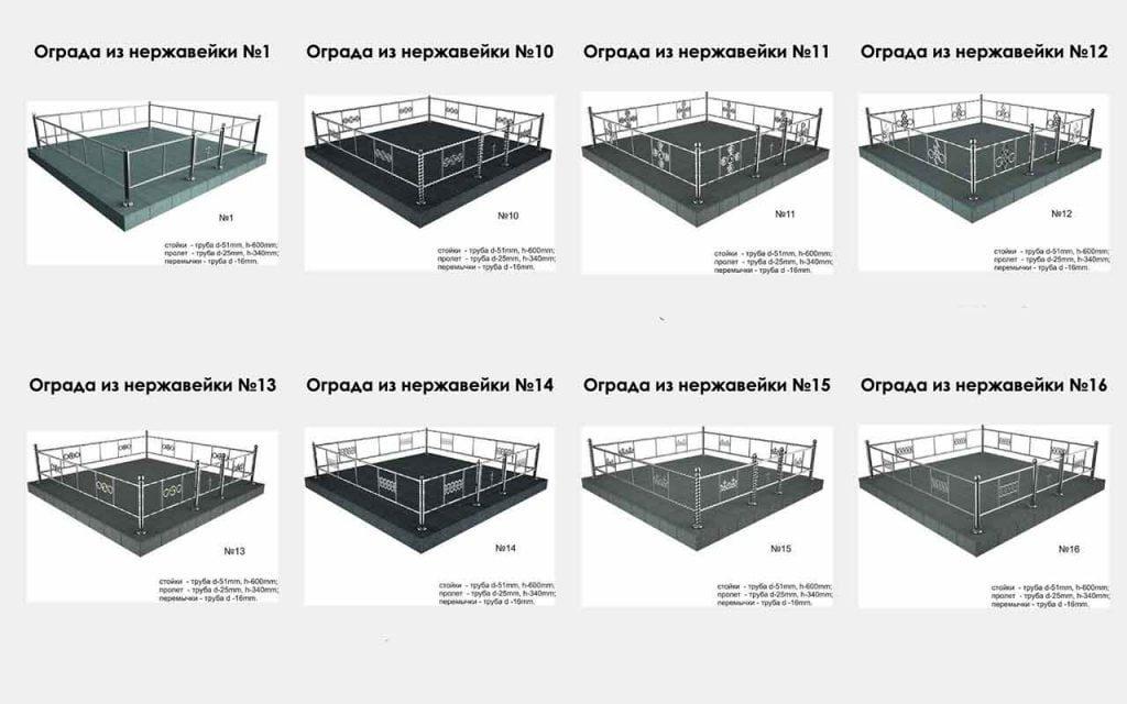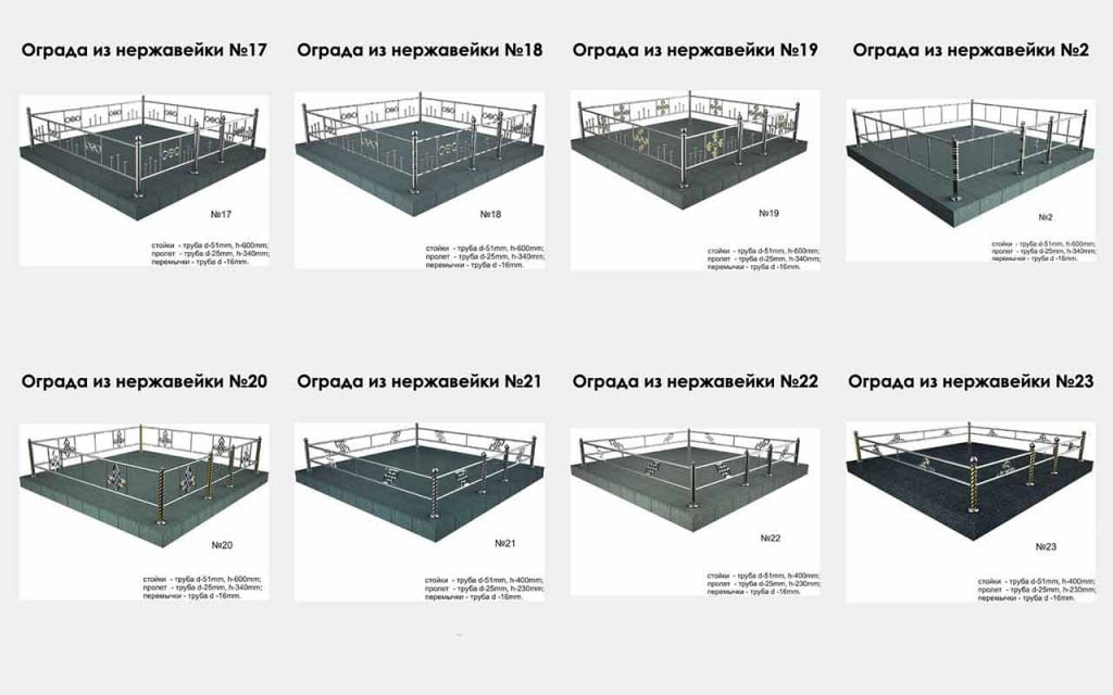 В зависимости от материалов, оградки делятся на металлические, из нержавейки и гранитные.