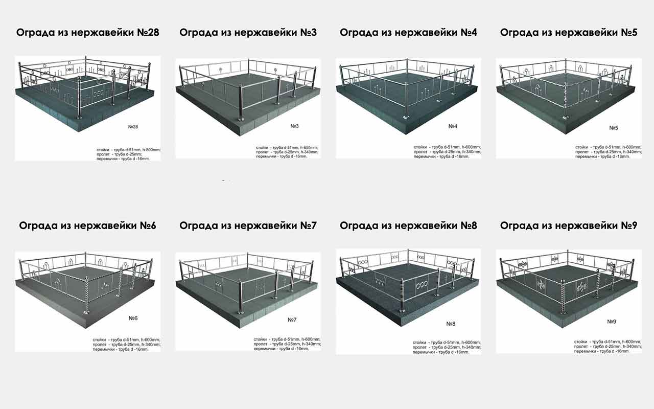 В зависимости от материалов, оградки делятся на металлические, из нержавейки и гранитные.